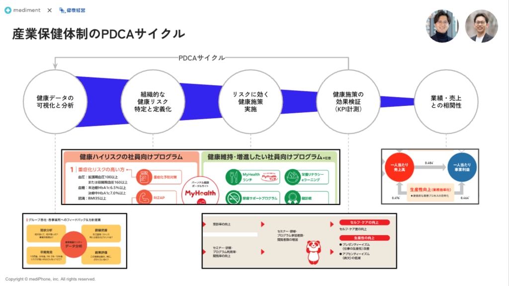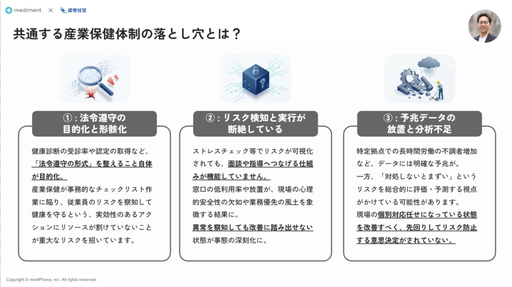 medimentからは、法令遵守を徹底していたはずの企業がなぜ落とし穴(労災・休職増など)に落ちてしまうのかに見舞われたのか、リアル事例をもとに、事例とデータから考える目指したい産業保健への対策を活用した未然防止策をお伝えします。